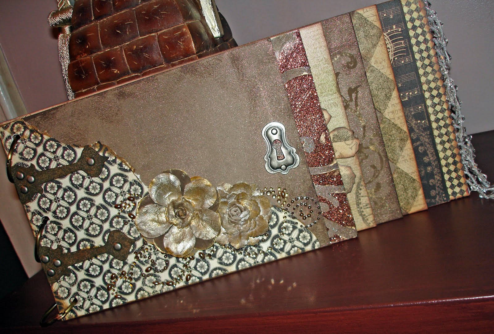This album has been in the making for quite some time! It is a Bo-Bunny waterfall chipboard album. One day I decided to spray it with my Tattered Angels Glimmer Mist in Tattered Leather. I was amazed at how awesome it looked! I inked the edges with Tim Holz's Distress Ink in Walnut Stain and that was it! It set up on the shelf with the other "to-do's". Then one day something magical happened... I saw these Graphic 45 papers sitting on the shelf at the scrapbook store in all their glory and instantly was inspired! I have been working on it on and off since then in between layouts and other projects...